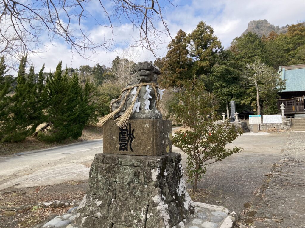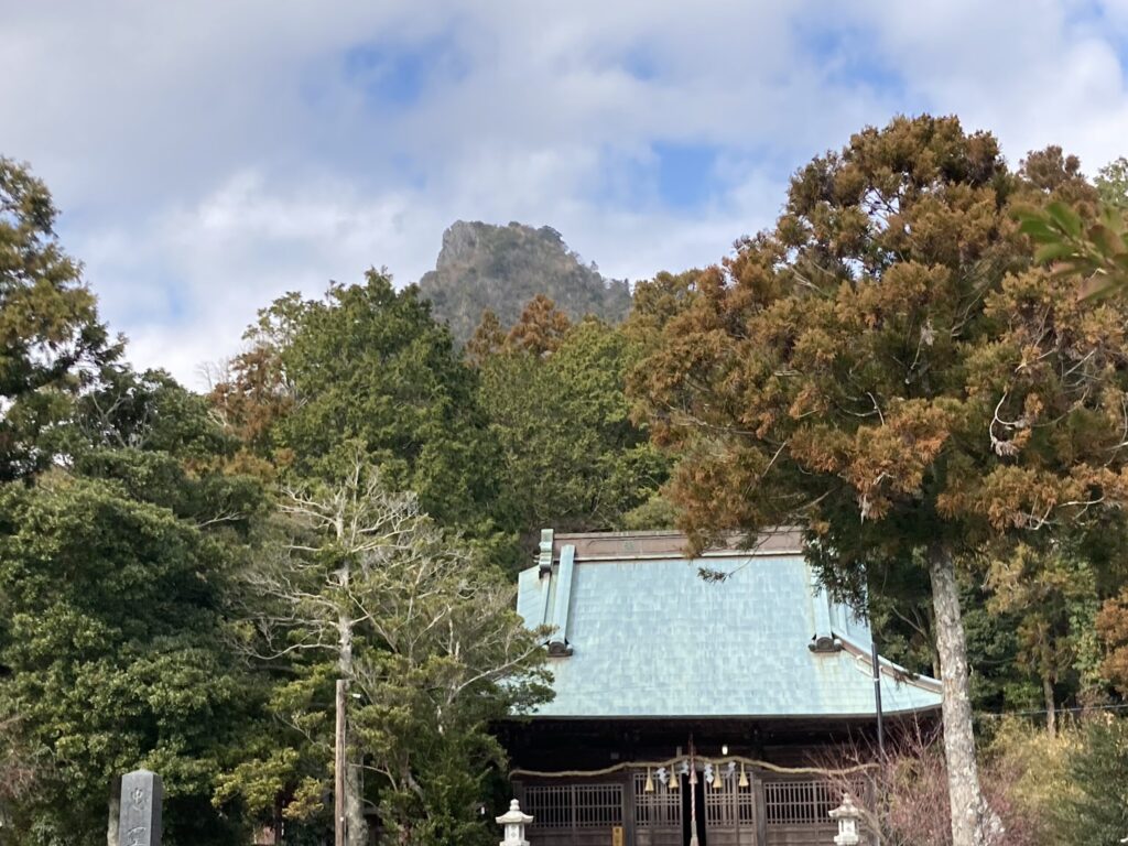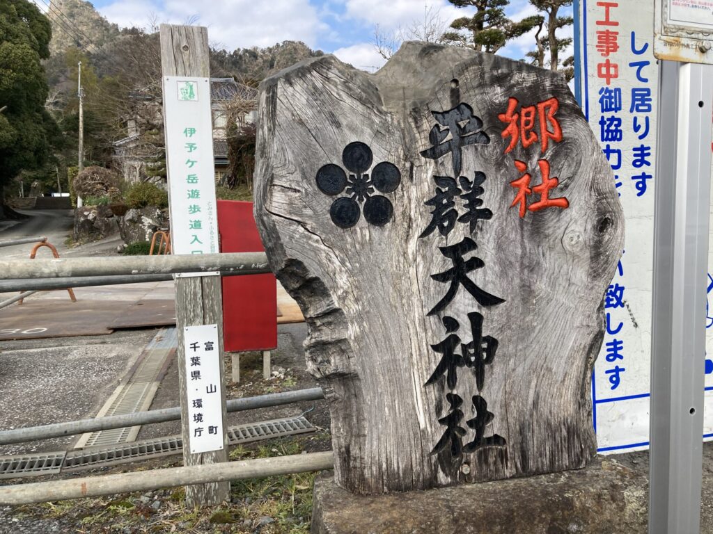 平群天神社の奥には伊予ヶ岳がそびえ立っています。伊予ヶ岳は富山三山の一つで、その山容は高く険しく奇岩がそびえ立つ南房総の名山です。天神社とともに天狗伝説が語りつがれている。