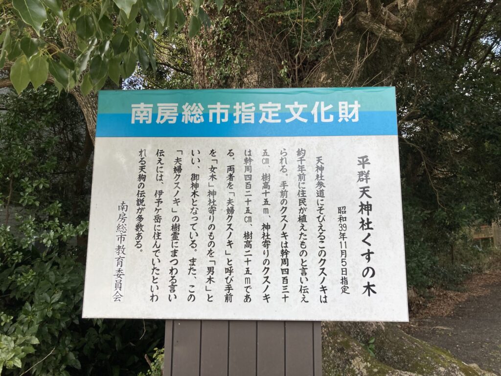 平群天神社は南房総市平久里中にあります。御祭神は菅原道真公(すがわらのみちざねこう)、木花之佐久夜毘売命(このはなのさくやひめのみこと)、天照大日霎貴命(あまてらすおおひるめのみこと)、建御名方神(たけみなかたのかみ)で、創建は文和2年(1353年)細川相模守が京都北野天神を勧請。特に学問の神として信仰されている。