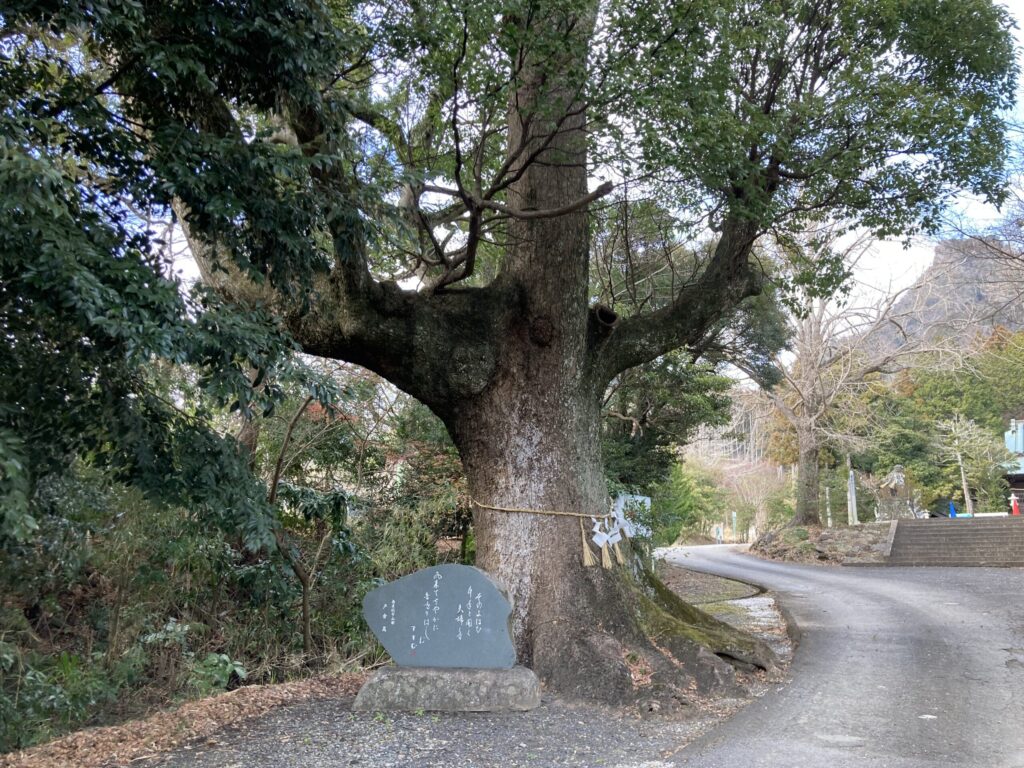 天神参道にそびえるこのクスノキは約千年前に住民が植えたものと言い伝えられる。手前のクスノキは幹周四百三十五cm、樹高十五m、神社寄りのクスノキは幹周四百二十日五cm、樹高二十五mである。両者を「夫婦クスノキ」と呼び手前を「女木」神社寄りのものを「男木」といい、御神木となっている。また、この「夫婦クスノキ」のい樹霊にまつわる言い伝えには、伊予ヶ岳に住んでいたといわれる天狗の伝説が多数ある。
