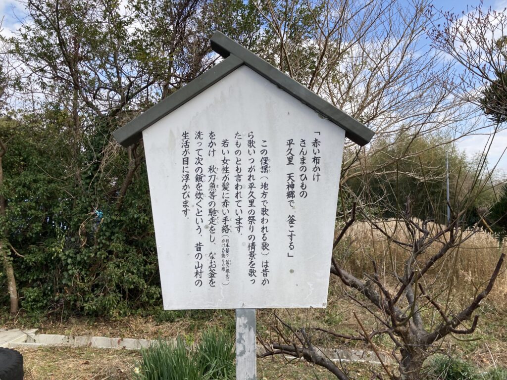 「赤い布かけ さんまのひもの 平久里 天神郷で 釜こする」