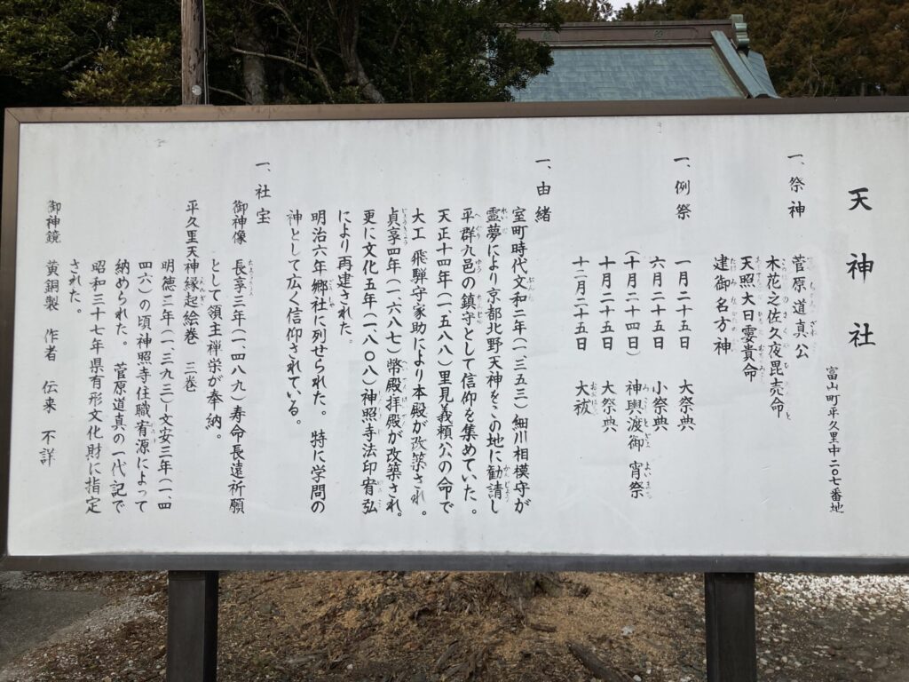 室町時代文和二年(一、三五三)細川相模守が霊夢により京都北野天神をこの地に勧請し平群九邑(ゆう)の鎮守として信仰を集めていた。