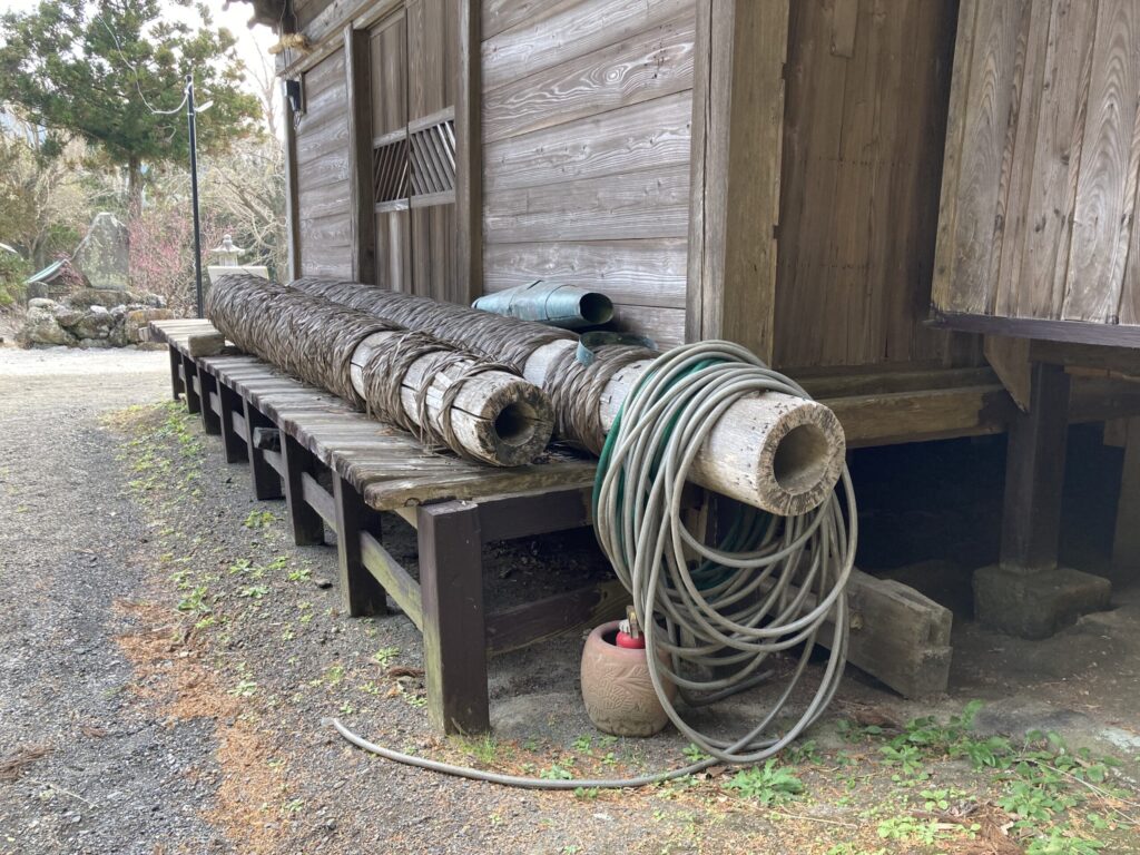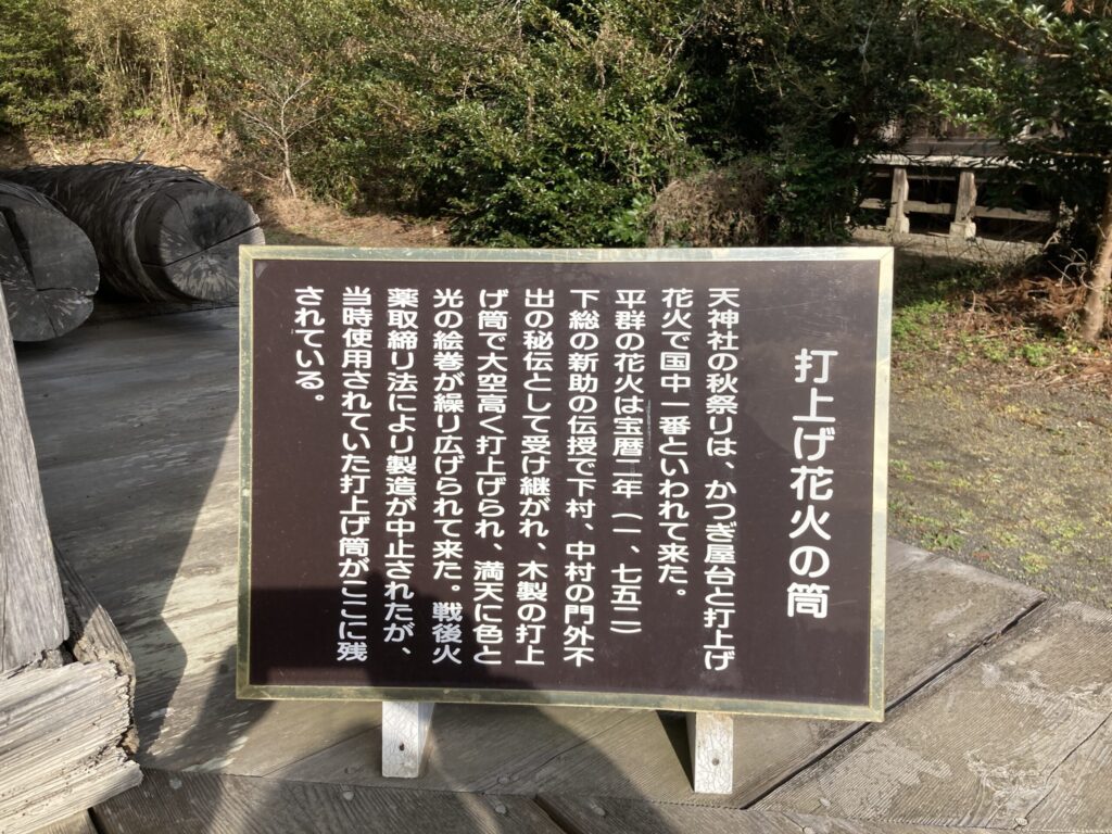 天神社の秋祭りは、かつぎ屋台と打上げ花火で国一番といわれて来た。平群の花火は宝暦二年(一、七五二)下総の新助の伝授で下村、中村のい門外不出の秘伝として受け継がれ、木製の打上げ筒で大空高く打上げられ、満天に色と光の絵巻が繰り広げられて来た。戦後火薬取締り法により製造が中止されたが、当時使用されていた打上げ筒がここに残されている。
