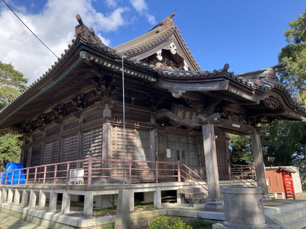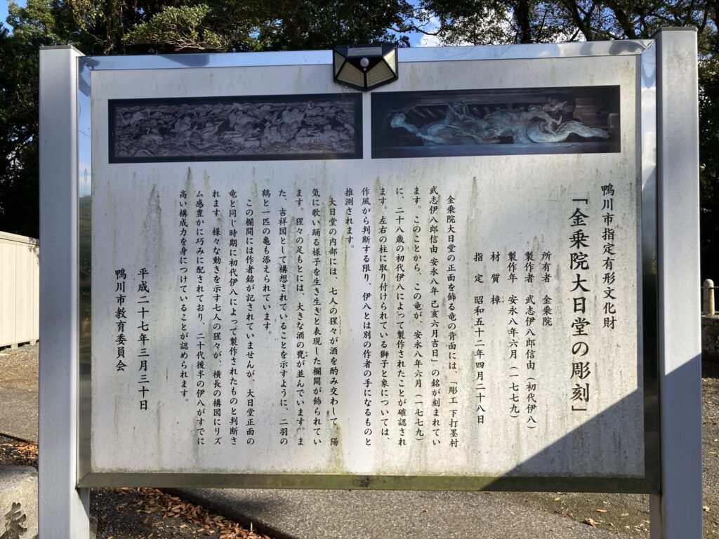 金乗院は鴨川市にある真言宗智山派の寺院です。大日堂は、平安時代初期に、弘法大師ゆかりの大日如来像を安置するために建てられたと伝わる。現在の大日堂は昭和7年に弘法大師一千百年御遠忌を記念し再建された。大日堂向拝の「竜」は初代伊八の作で市指定有形文化財。