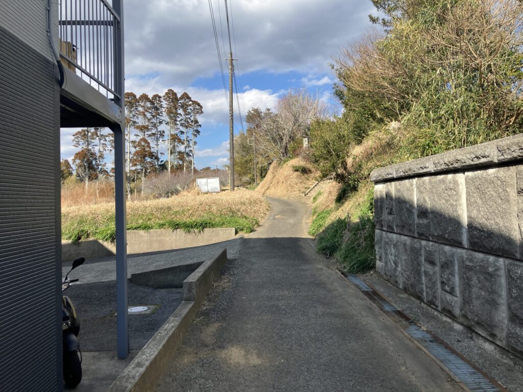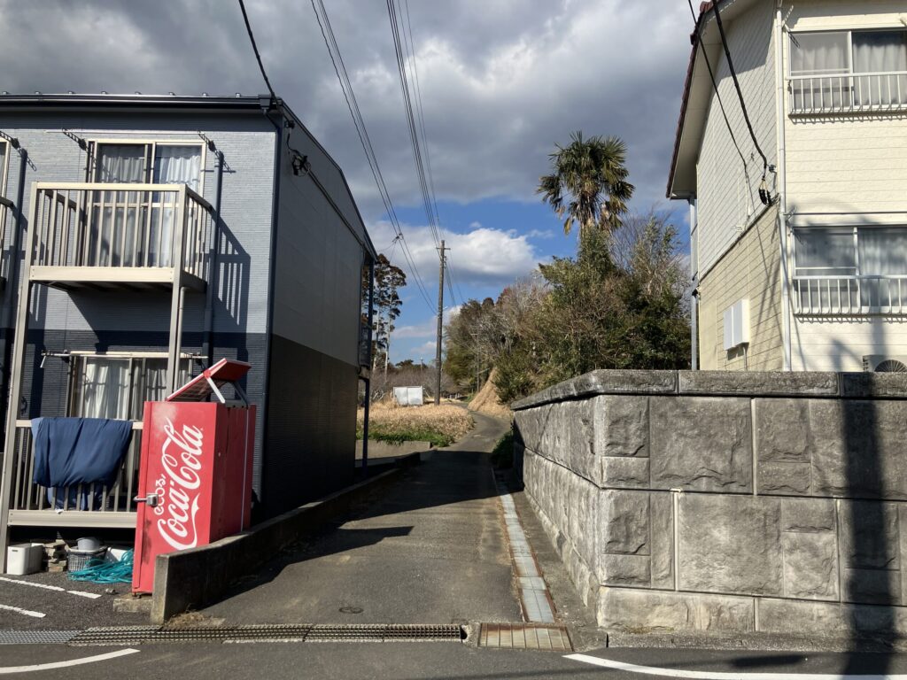 2件のアパートの間の道を進む。