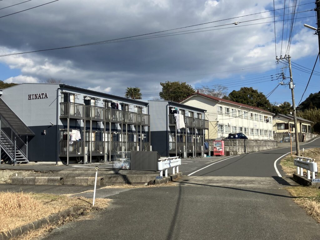 道幅が少し広くなり左手にアパートが2軒たっている。