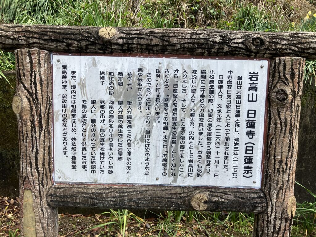 日蓮聖人は、文永元年(一二六四)十一月十一日小松原法難の際、地頭の東条景信から襲撃をうけ、眉間に三寸余りの刀傷を負いました。からくも死地を脱した聖人は、北浦忠吾、忠内とともに岩高山に入りました。そして、この地で傷の養生をしたことから、「日蓮聖人刃難避難養生の霊場」として知られて古くから「剣難除けの祖師」または、「お綿帽子の祖師」と呼ばれています。