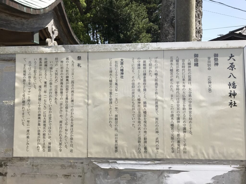 大原八幡神社はいすみ市大原にあります。御祭神は誉田別命(ほんだわけのみこと)で創建は1501年(文亀元年)と伝わる。毎年9月23・24日に行われる「大原はだか祭り」に参加します。
